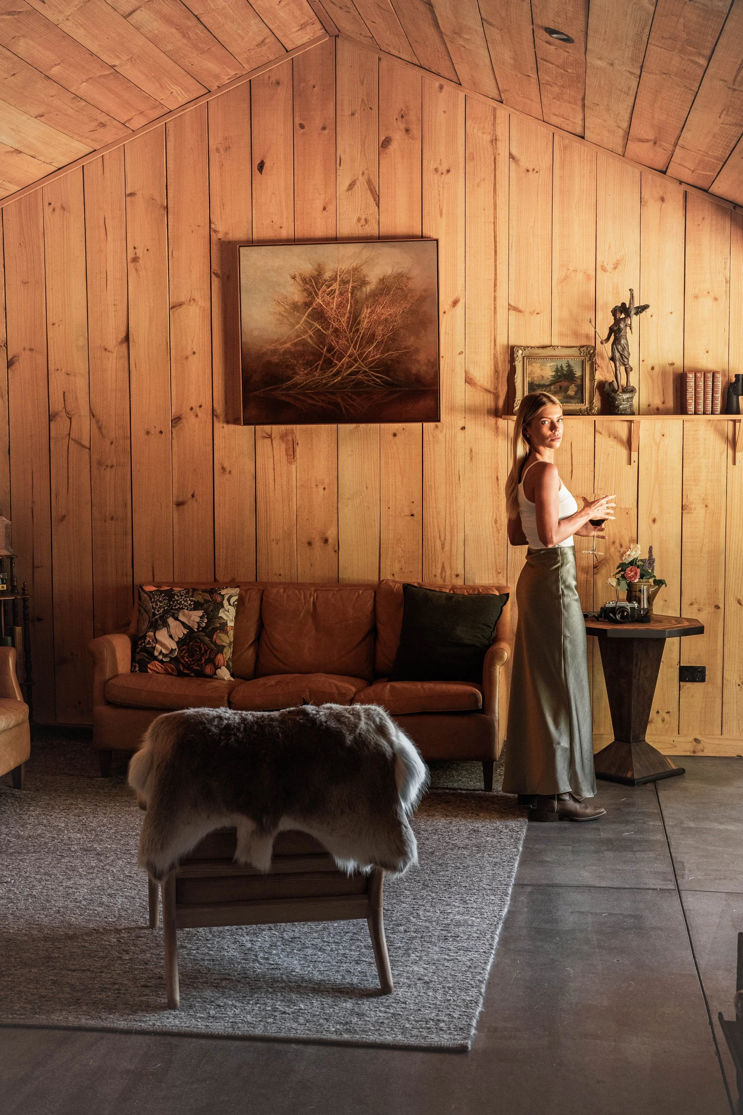 As evening settles over Boscobel Estate, guests are invited to unwind in the outdoor wood-fired hot tub set among the open meadows. With a glass of wine in hand, it is a peaceful moment to soak beneath the vast Southern Highlands sky.